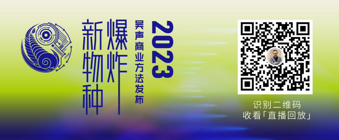 2023年8月6日,一年一度的立秋演讲「新物种爆炸·吴声商业方法发布2023」,在751·D Park北京时尚设计广场97罐举行。第7届新物种爆炸主题为「风再起时」,场景方法论提出者、场景实验室创始人吴声表示,2023场景品牌开启「对话」新周期,以6个对话线索,系统讲述新物种更本质的创新力量,并发布2023新物种5大预测。