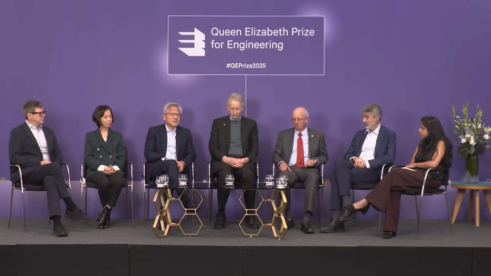 本次圆桌访谈汇聚了2025年伊丽莎白女王工程奖六位得主——深度学习”三巨头”杰弗里·辛顿(Geoffrey Hinton)、杨立昆(Yann LeCun)、约书亚·本吉奥(Yoshua Bengio),NVIDIA掌舵者黄仁勋(Jensen Huang)与首席科学家比尔·戴利(Bill Dally),以及ImageNet创建者李飞飞。