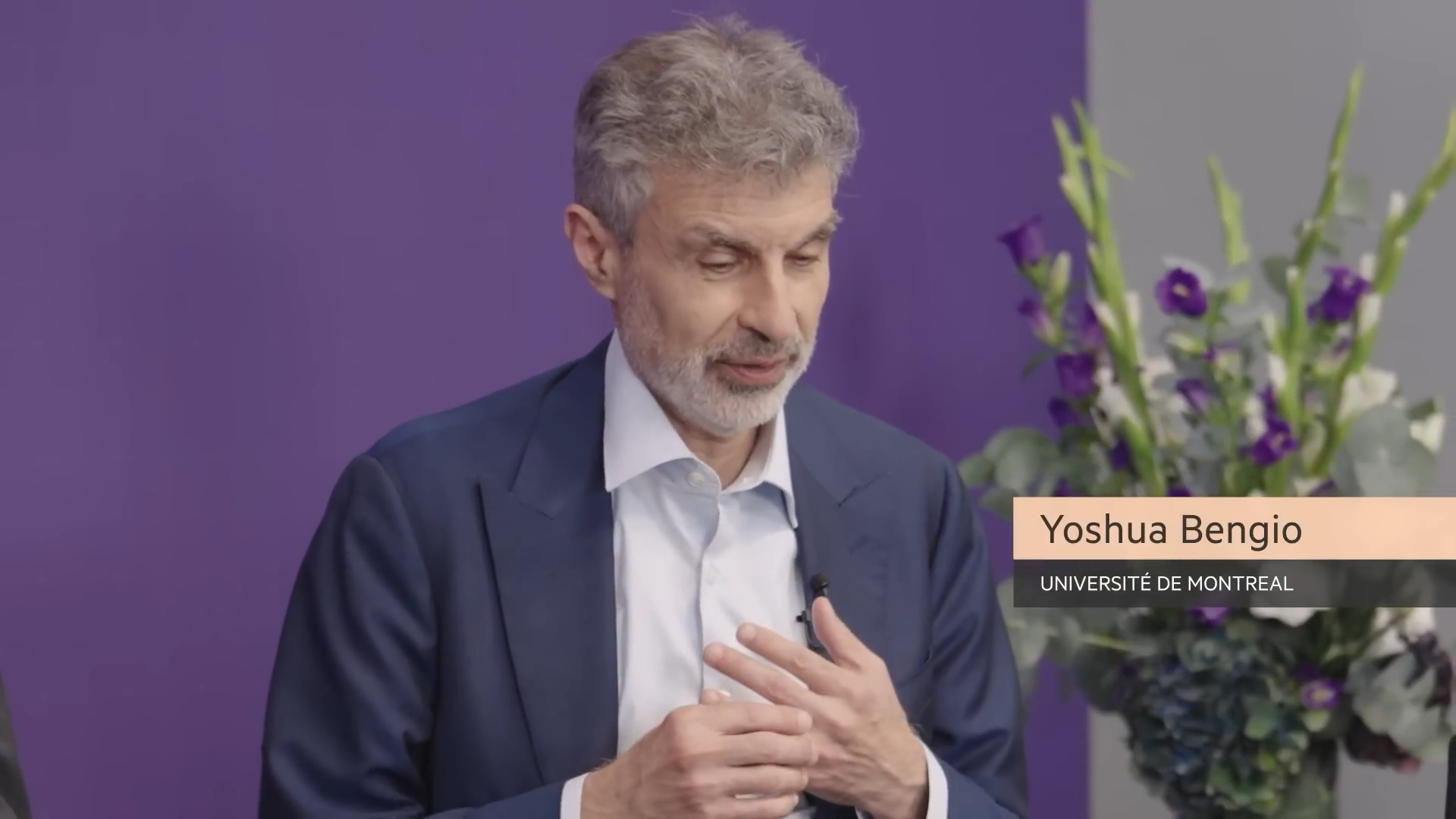 第二个时刻是两年半前,ChatGPT 问世后,我意识到:哦,我们在做什么?如果我们建造了理解语言、拥有目标而我们又无法控制这些目标的机器,会发生什么?